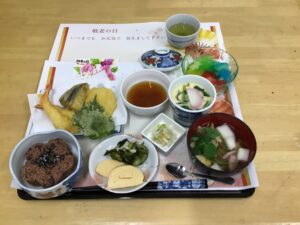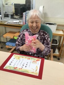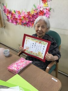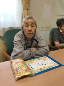 ご馳走を食べて頂き 職員より賞状の贈呈 一人一人の好みを考えた靴下のプレゼントをさせて頂きました。