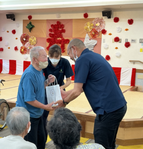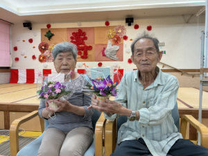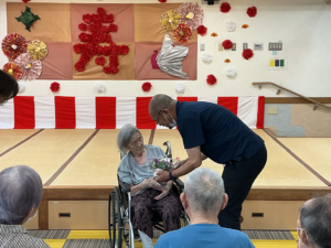 最高齢上位3名の利用者様にささやかですが、お花をプレゼントさせていただきました。