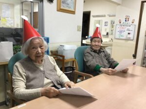グループホームのクリスマス会は赤いとんがり帽子を『恥ずかしいわ』と言いながらも…🤭